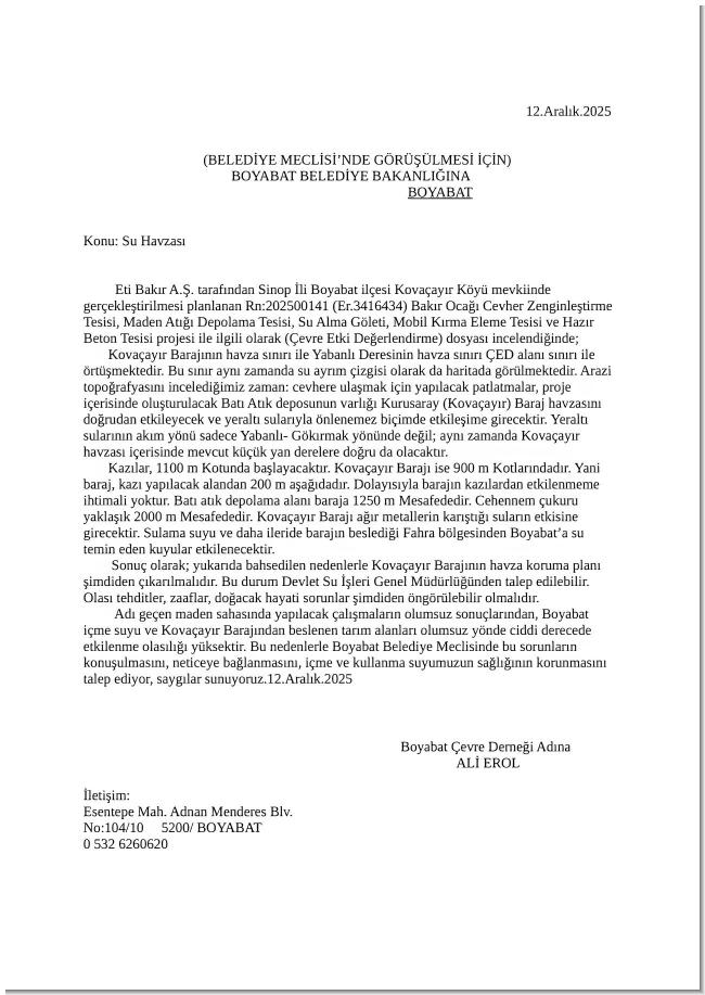 Boyabat Çevre Derneği yaptığı basın açıklaması ve verdiği dilekçede, Eti Bakır A.Ş. tarafından Boyabat Kovaçayır köyü mevkisinde yapılması planlanan Bakır Ocağı, Cevher Zenginleştirme Tesisi, Maden Atığı Depolama Tesisi, Su Alma Göleti, Mobil Kırma Eleme Tesisi ve Hazır Beton Tesisi projesine ilişkin önemli bir girişimde bulundu. Dernek, söz konusu proje için yürütülen Çevresel Etki Değerlendirme (ÇED) sürecine dikkat çekerek, maden sahasında gerçekleştirilecek faaliyetlerin Boyabat’ın içme suyu kaynaklarını ve Kovaçayır Barajı’ndan beslenen tarım alanlarını olumsuz yönde etkileme riskinin yüksek olduğunu vurguladı.