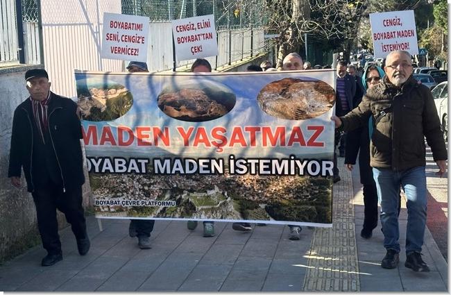 Sinop Öğretmenevi’nde bir araya gelen vatandaşlar, imzalı dilekçelerle birlikte pankartlar eşliğinde Sinop Çevre, Şehircilik ve İklim Değişikliği İl Müdürlüğü’ne yürüdü. İl müdürlüğü önünde Boyabat Çevre Derneği Başkan Yardımcısı Bilal Tığlı tarafından açıklama yapıldı.