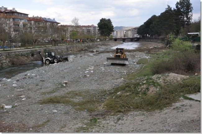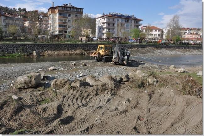 Belediye ekipleri ve özel idare tarafından yürütülen çalışmalarda iş makineleri çay yatağına girerek biriken moloz, ağaç parçaları ve çeşitli atıkları temizledi.