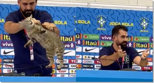 2022'de Dünya Kupası'nda gerçekleştirilen basın toplantısında bir kedi, Vinicius Jr.'ın röportajı sırasında masaya atladı. Brezilyalı yıldız kediye gülerek tepki verirken, basın sözcüsü ise onu fırlatıp masadan aşağıya attı.