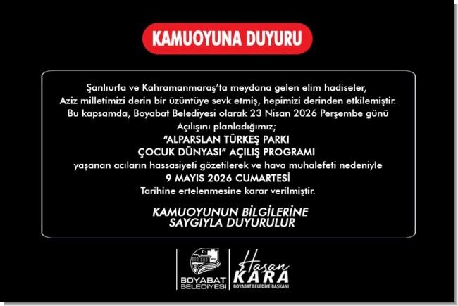 Boyabat Belediyesi tarafından 23 Nisan 2026 Perşembe günü gerçekleştirilmesi planlanan “Alparslan Türkeş Parkı Çocuk Dünyası” açılış programı ileri bir tarihe ertelenmiştir.
