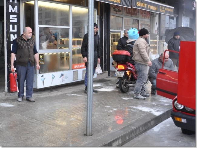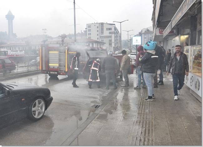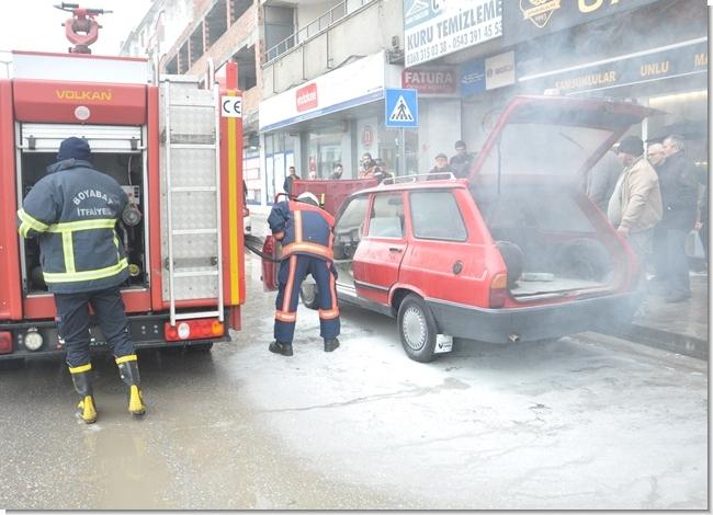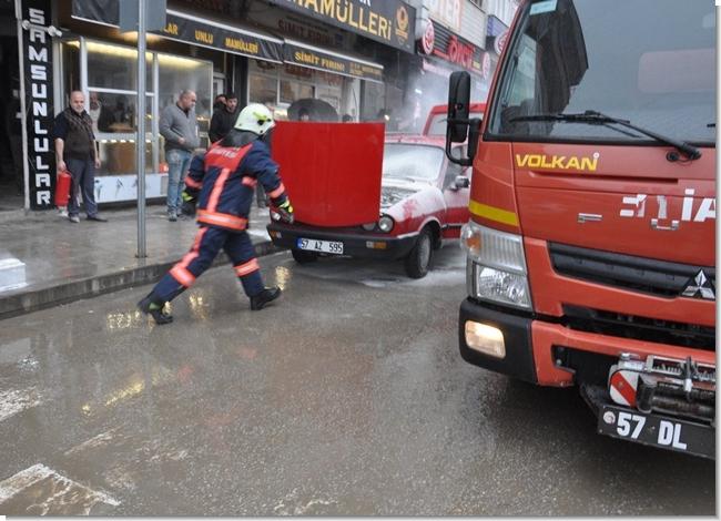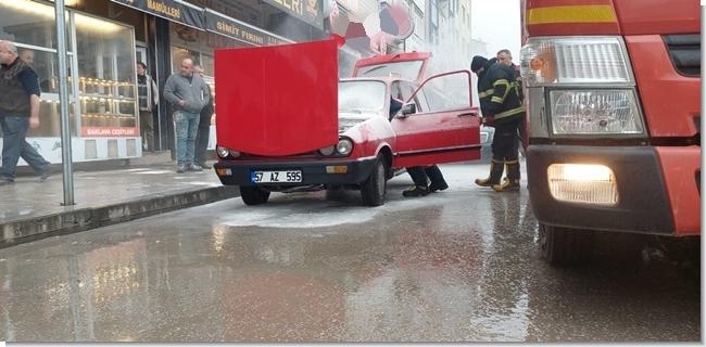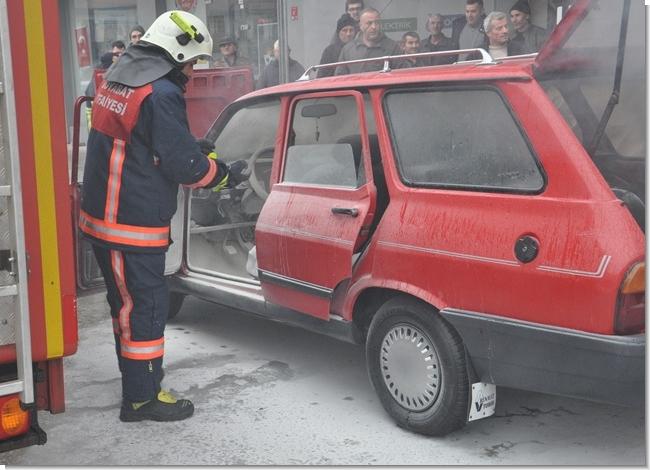 İşyeri önünde aniden alev alan otomobile, bir esnaf tarafından işyerinde bulundurulan yangın tüpüyle ilk müdahale yapıldı.